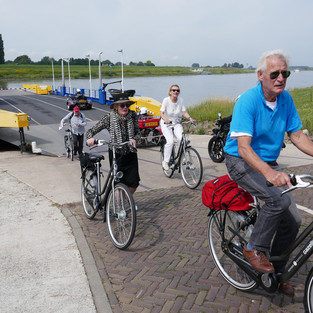 De tweede dag Schitterend fietsweer. We gaan vandaag de Waal langs. Eerst door Ubbergen steil naar beneden. Dan de Waalbrug op. Ik moet denken aan de moedige Jan van Hoof die door de Duitsers aangebrachte explosieven onschadelijk maakte. Met een trap dalen we af naar de dijk langs Lent-Oost. We blijven vlak langs de Waal fietsen en laten Bemmel en Haalderen links liggen. Dan om de steenfabriek heen, een man met petunia’s, een beeld-houwer, een fabriekspijp van 58 m., ingegraven tanks tegen de Russen en verder naar Gendt voor koffie bij ‘19’. Patricia scoort wat oud-roze jurken. Binnendoor naar Doornenburg met het ‘Floris’-kasteel aan de Linge. We steken met een gierpont het Pannerdensch Kanaal over (eigenlijk de Rijn, maar dan een beetje gekanaliseerd) en bereiken door de Lobberdense Waard het voetveer over het Bijlandsch Kanaal (eigenlijk de Rijn, maar dan een beetje gekanaliseerd) voor de overvolle overtocht naar Millingen a/d Rijn, de laatste Nederlandse plaats op de zuidoever van de Boven-Rijn. Een paar kilometer oostelijker ligt Lobith waar de Rijn volgens de boekjes ons land binnenkomt. Wij eten op het terras van de Gelderse Poort. De keuken kan de drukte niet aan en dat zullen we ‘s avonds opnieuw meemaken.